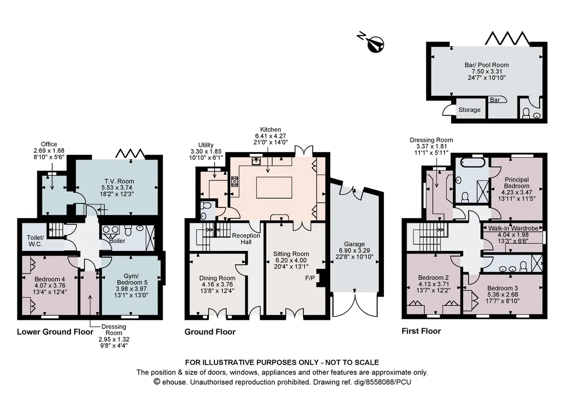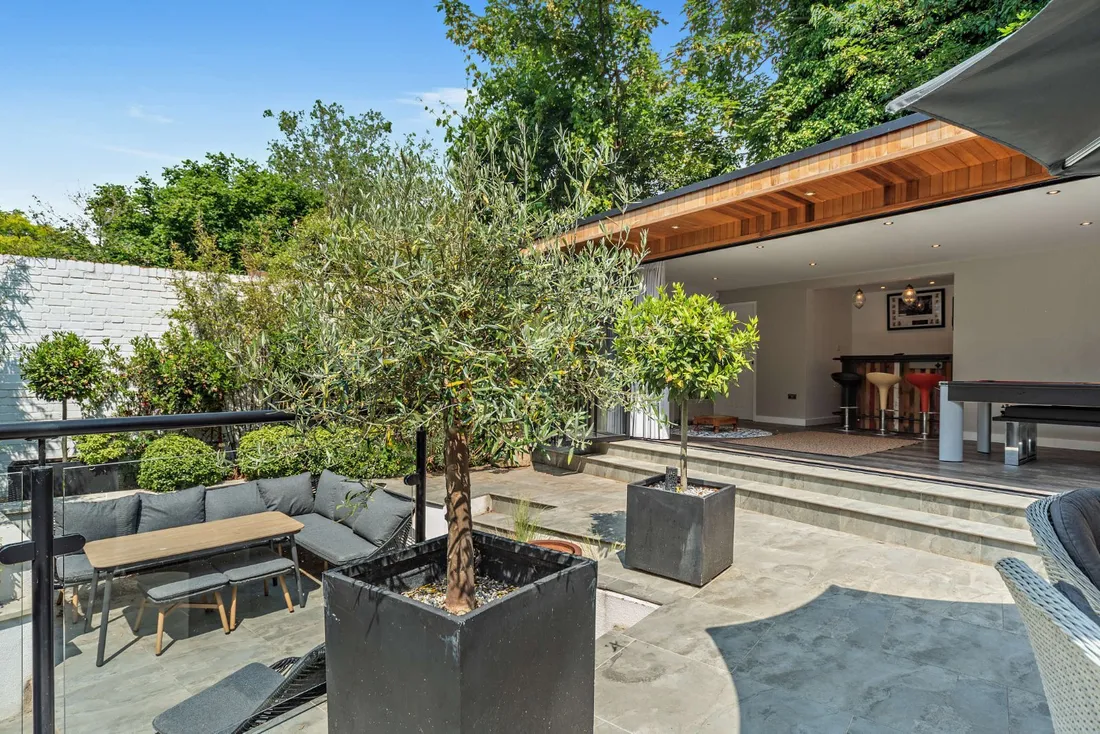 Situated on the lower ground floor are two further bedrooms with a shared shower room, a separate cloakroom, and a cinema room with concealed office with two working areas. Bi-fold doors open the lower, secluded patio area with covered hot tub area.