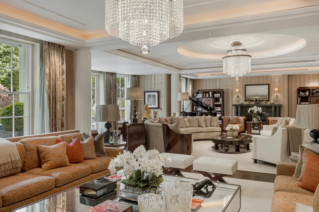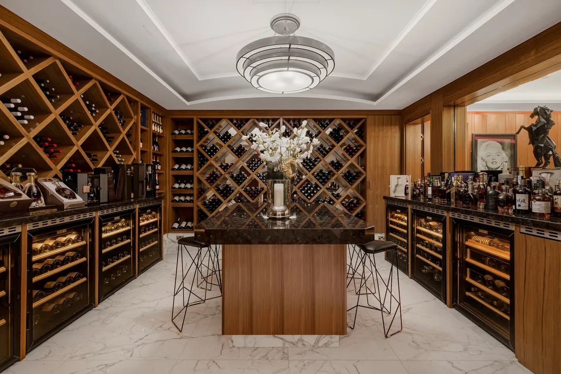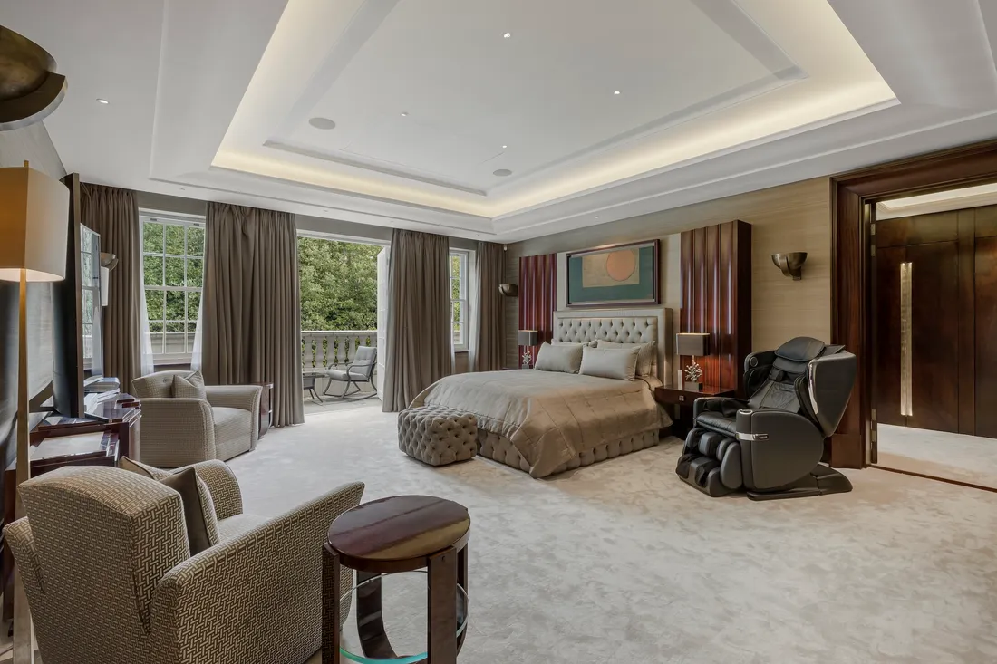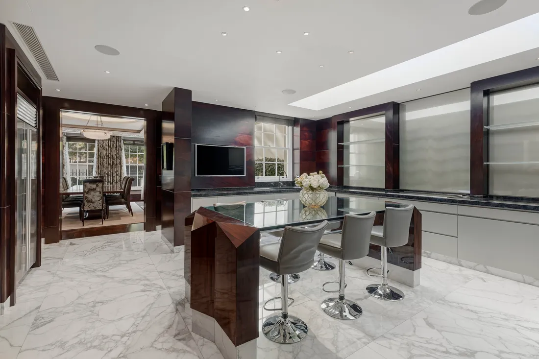 The bespoke family kitchen, with its marble floors and granite breakfast bar seating up to eight, has top-of-the-line Subzero appliances. A second fully-fitted professional-grade catering kitchen comes complete with a dumb waiter, perfect for entertaining on a large scale.