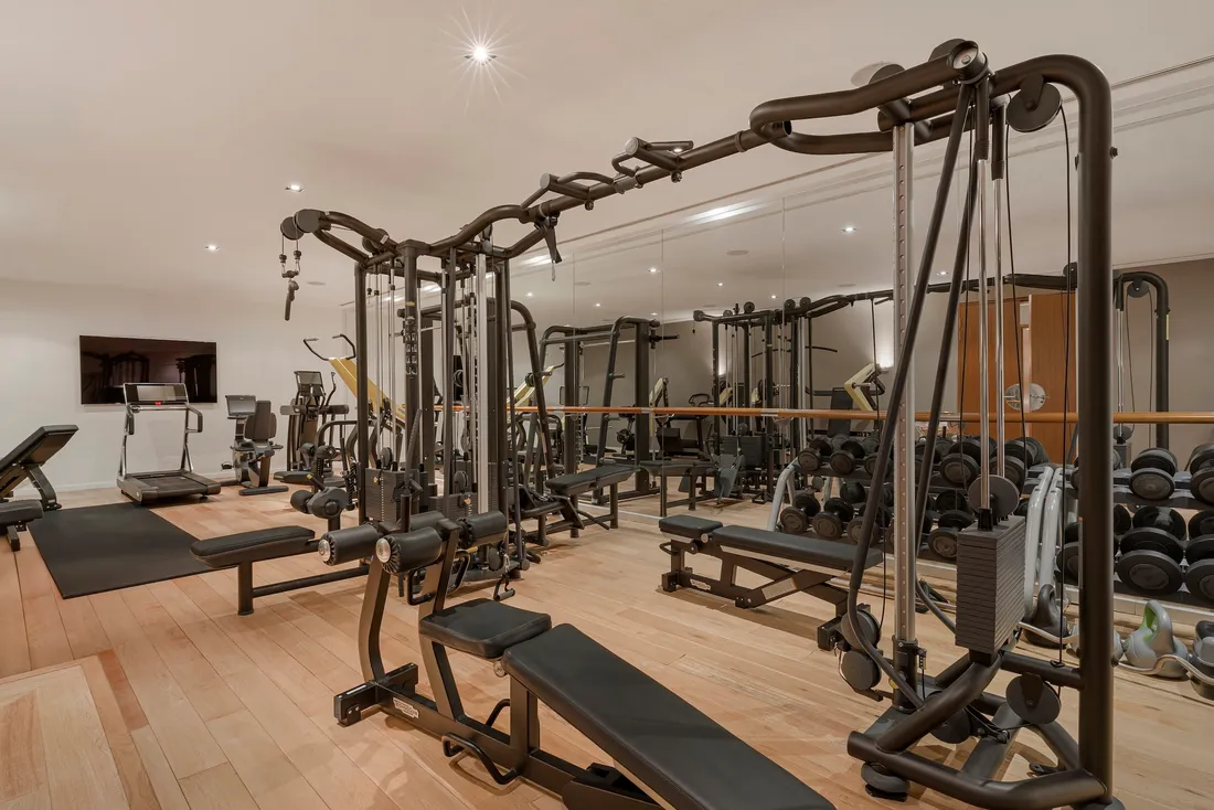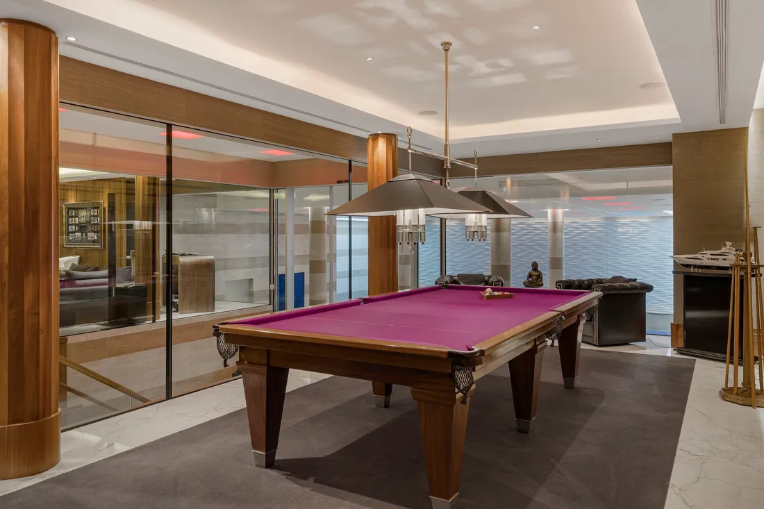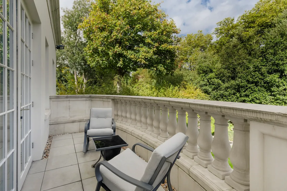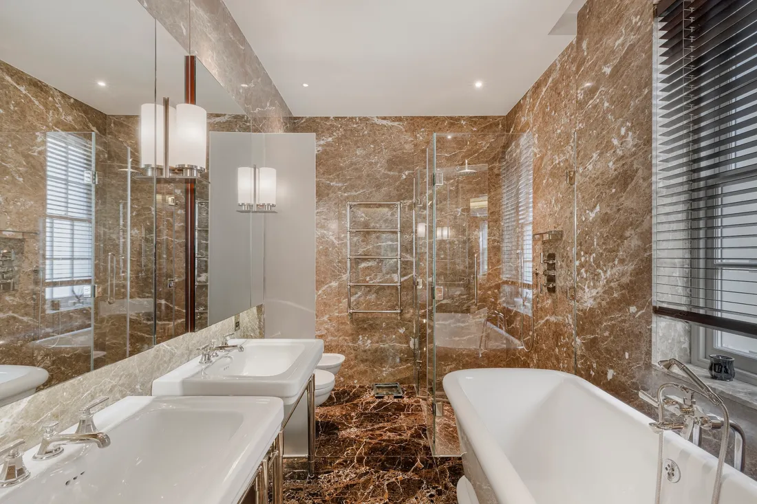The bespoke family kitchen, with its marble floors and granite breakfast bar seating up to eight, has top-of-the-line Subzero appliances. A second fully-fitted professional-grade catering kitchen comes complete with a dumb waiter, perfect for entertaining on a large scale.