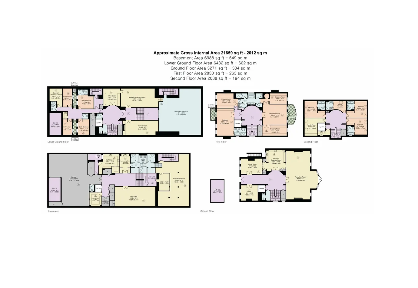 In the basement, a concealed car lift, and a secure car park with space for five cars lie next to a security monitoring room, a walk-in strongroom, plant rooms, laundry facilities, and separate staff quarters with four bedrooms, two shower rooms, and a staff cloakroom.