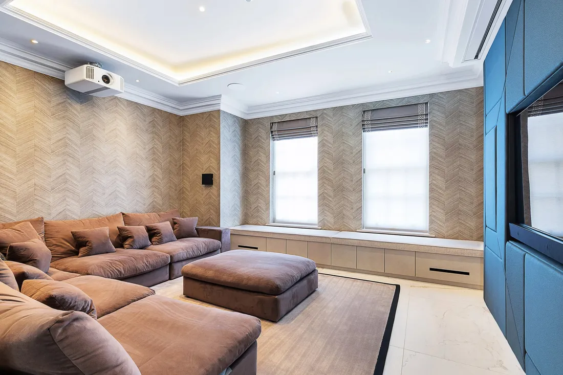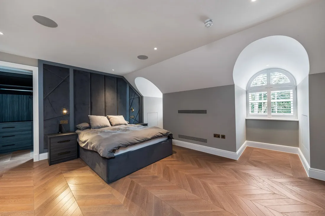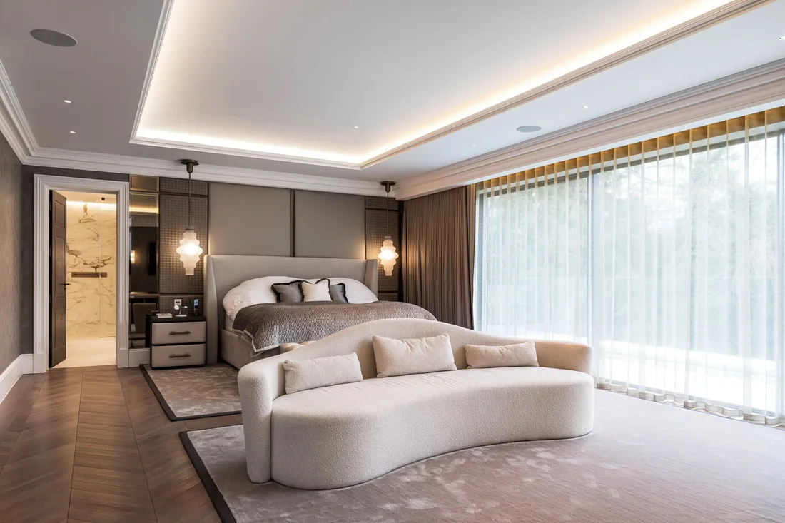 The principal bedroom spans the entire rear width with a large boutique en suite bathroom, bedroom with doors onto a balcony, and two well appointed dressing rooms. With coffered ceilings housing the AC vents and LED soft lighting, this is the perfect suite for quite relaxation at the end of a busy day.